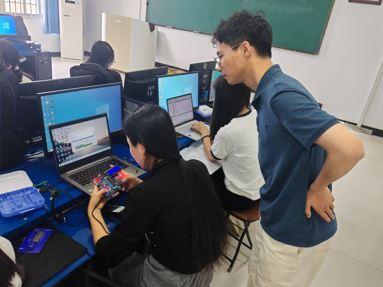本次活动受到了学院领导的关怀与支持,6月6日,学院院长严正香、教学副院长汤秀芳亲临现场指导实践教学工作,详细询问了同学们的“密码箱”设计情况,严院长表示综合实践教学要继续开展、多开展,做好教学实践内容的积累、更新、不断地提升实践内容的品质,不仅要进行学期的综合实训,也要将项目小模块化形成“项目式”课堂教学。在观摩同学们DIY的功能时,汤院长肯定了同学们的自主创新能力和自我驱动精神,鼓励大家在知识的海洋中广泛汲取,让理论与实践的融合绽放出更加璀璨的光芒。