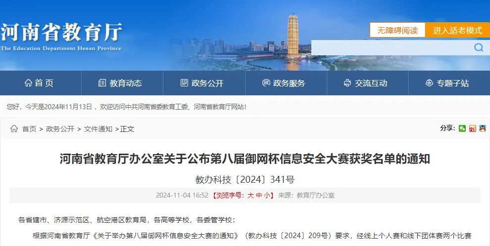 11月4日,河南省教育厅发布《关于公布第八届御网杯信息安全大赛获奖名单的通知》(教办科技〔2024〕341号)。根据河南省教育厅《关于举办第八届御网杯信息安全大赛的通知》(教办科技〔2024〕209号)要求,经线上个人赛和线下团体赛两个比赛环节,信阳职业技术学院亚洲精品无码久久久久久久代表队,凭借精彩的发挥,在各大高校参赛选手中脱颖而出,喜获9个奖项:线上个人赛二等奖6项、三等奖1项,线下团体赛一等奖2项。